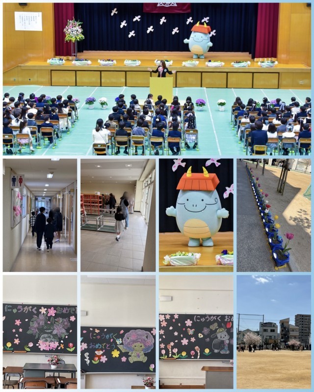 主役の1年生は、普段とは違う装いに身を包み、小学校に登校してきました。元気いっぱいの人、恥ずかしそうにしている人、緊張している人、おうちの人と離れるのが寂しい人、、、など一人ひとりいろいろな思いを抱えているように思いました。でも、いざ入学式が始まると、しっかりと椅子に座りお祝いの「おめでとうございます」と言う言葉に元気いっぱい「ありがとうございます。」と答えていました。お祝いに駆けつけた池田小学校のマスコットキャラクターのとうりゅうもんを見て大喜びしていました。その後、記念写真でもとうりゅうもんと一緒に撮影しました。