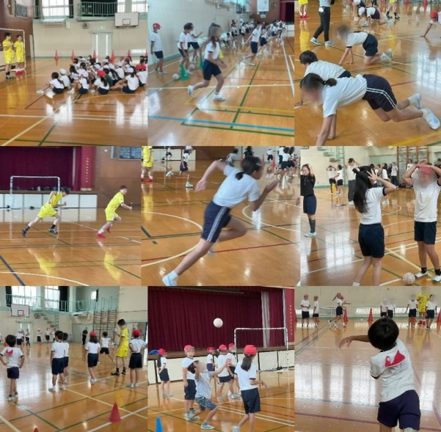 5年生と6年生のOSPのようすです。今年は、ハンドボールのプロチーム、「アルバモス大坂」から2名の選手にお越しいただき、ハンドボールに取り組みながら、楽しく「走る」「跳ぶ」「投げる」などの運動の基礎となる体幹を鍛える運動を行っていただきました。企画していただいた、PTA実行委員のみなさん、そして参加していただいた保護者のみなさまに、この場をおかりしてお礼申し上げます。「ありがとうございました。」