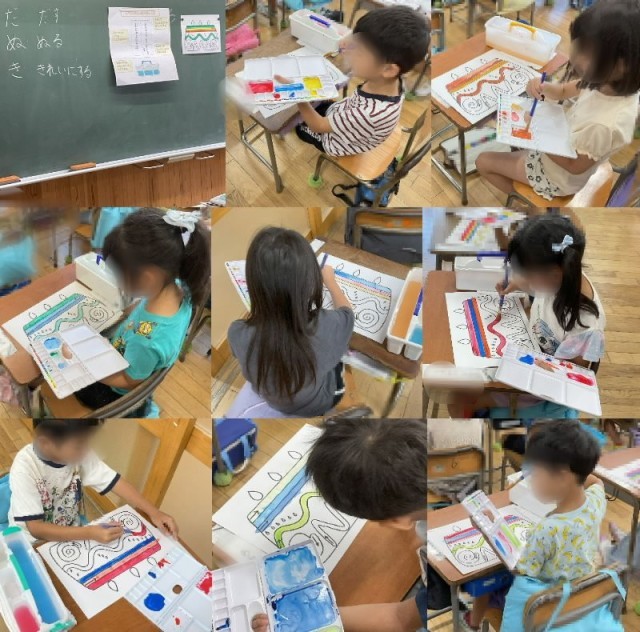 1年生は図工の時間に、絵の具に挑戦していました。ケーキの絵を使い、直線や波線に丁寧に色を塗り、筆の使い方を学習していました。
