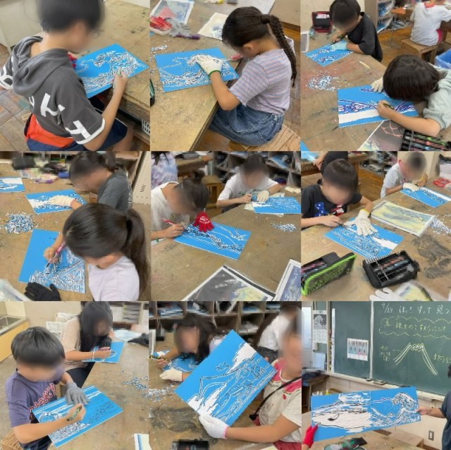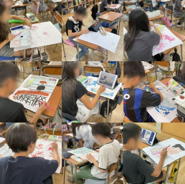 6年生は図工の時間に、浮世絵を使った作品作りを行っています。下書きの終わった児童が色を塗り始めていました。