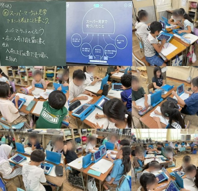 3年生は、社会見学で学んだスーパーの工夫を思考ツールのクラゲチャートにまとめ、それを活用しながら、グループごとにその工夫の理由を考えていました。