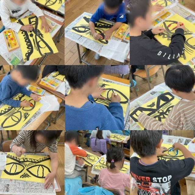 1年生は図工の時間に、電子黒板のお手本の絵を参考にしながら、クレパスを使い「猫の顔の目」に色を塗っていました。丁寧にクレパスを塗りこんでいました。