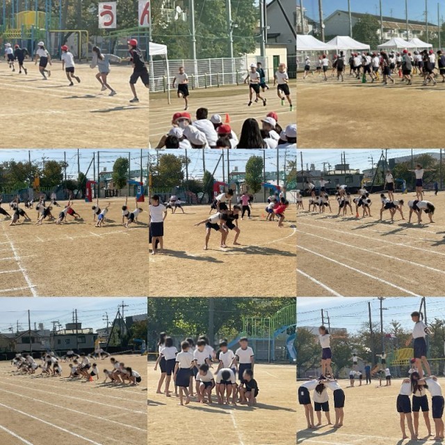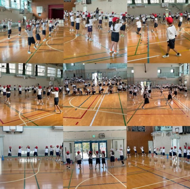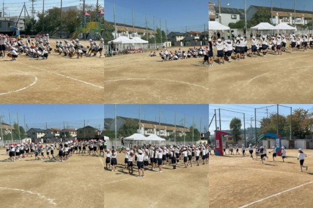 1年生・2年生・6年生の、団体演技の練習のようすです。6年生は、団体演技の練習の前に、100m走の退場の練習も行っていました。