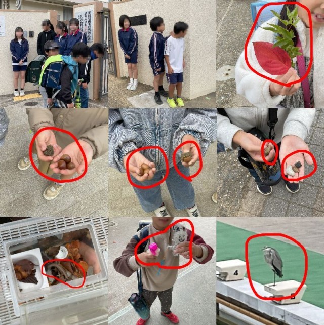 昨日から中学生が職場体験で3日間、秦小にきています。今朝も校門で登校してくる子どもたちに元気に挨拶していました。また、「紅葉した落ち葉」や「どんぐり」そして、「ハート型の石」や「カナヘビ」、手作りの「キャラクター作品」もみることができました。また、プールサイドに大きな「アオサギ」が現れたので、子どもたちは大喜びでした。