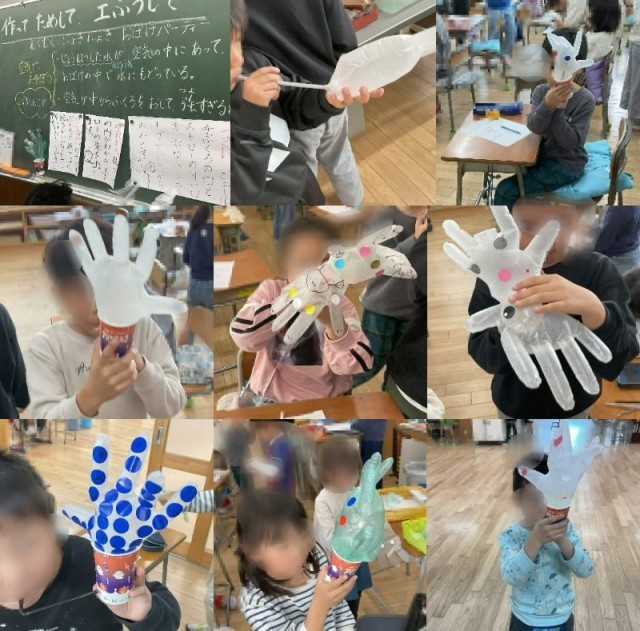 2年生は生活科の時間に、紙カップとビニール手袋、そしてストローを使った、おばけ作品を作っていました。色々な、おばけ作品をみることができました。