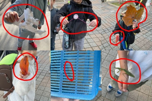 今朝は、少し風があり、肌寒い中での登校となりました。今日も、「自作の作品」や「ぶんぶんゴマ」、秋らしい「紅葉した落ち葉」やお面のような、「大きな落ち葉」が通っていきました。そして寒くなってきてるのに、「ショウリョウバッタ」や「カマキリ」もまだみることができました。