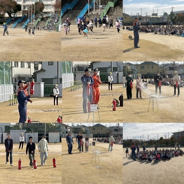 2時間目に火災避難訓練を行っていました。子どもたちが運動場に避難した後、池田市消防署の方から、避難する際の注意事項や、消火器の使い方のお話を聞くことができました。その後、代表の先生や6年生児童が実際に消火器使った、消火訓練をおこないました。