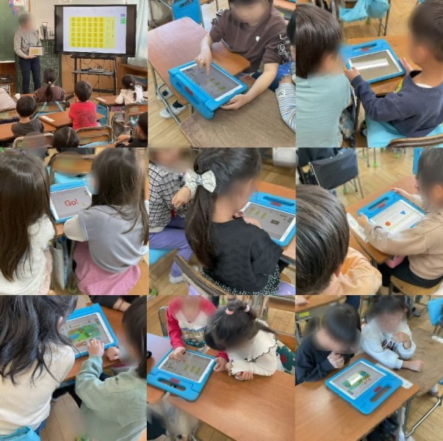 1年生は、通級指導担当者による、「言葉の授業」を受けていました。タブレットの「デジタルミム」を使い、拗音(ようおん)の学習を行っていました。子どもたちは、ゲーム感覚でたのしく学ぶことができていました。