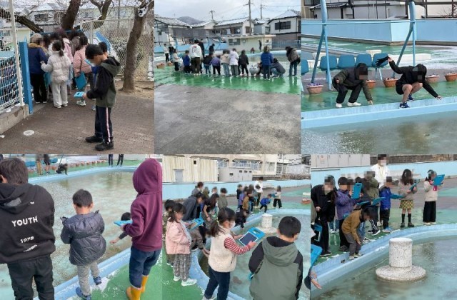 今朝(9日)は、昨日からの雪で路面が凍結するなど登校中の怪我が心配されましたが、大勢の保護者の方が送ってくださったこともあり、大きな事故なく登校することができました。ありがとうございました。 学校では、雪玉やツララなどを楽しそうに見せに来る児童が大勢いました。2年生と6年生は、小プールに張った「氷」を観察。タブレットで撮影したり、落ちないように気をつけながら氷を割って取ろうとしたりと、楽しく観察をしていました。