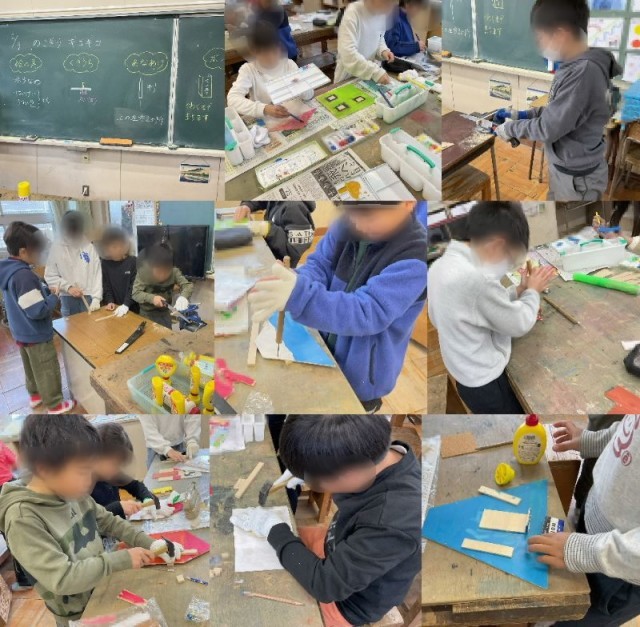 4年生は図工で「かべかけボード」作りを行っていました。のこぎりで切り出した板に「絵の具で色を塗る」「キリで穴をあける」「金づちでくぎを打つ」「ボンドで板を貼る」の4つの工程に真剣に取り組んでいました。