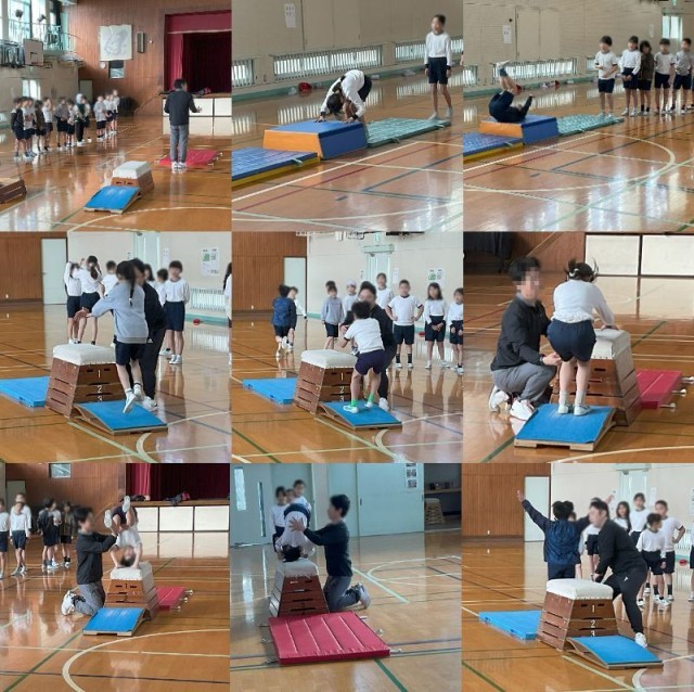 3年生は、跳び箱運動の出前授業で「台上前転」に挑戦しました。まずはマットで前転の練習をしっかりと行ってから、本番の跳び箱での練習に挑んでいました。