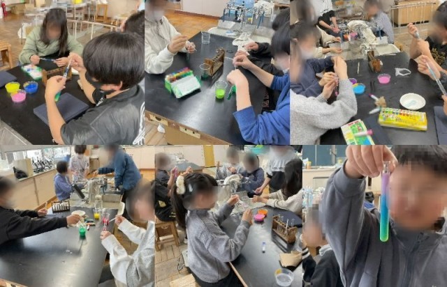 理科の時間には、砂糖水を使った「虹色の水」を作る実験に挑戦しました。濃度の違う色水をスポイトで慎重に試験管へ重ねていく繊細な作業です。完成した色鮮やかな試験管を、嬉しそうに見せてくれる児童も多く、教室に笑顔が広がっていました。