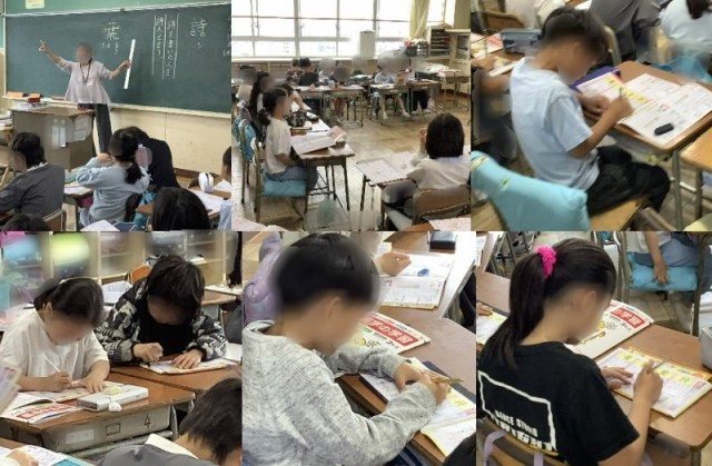 3年生の教室では、漢字学習に取り組んでいました。まずは漢字練習帳の使い方を全員で確認。その後は、ドリルを終えた児童から順に練習帳へと進み、一文字ずつ丁寧に筆を進めていました。