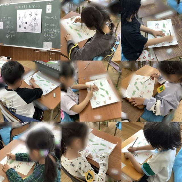 1年生は算数の「なかまあつめ」に挑戦。プリントの中の同じ絵柄を見つけ、しっかりと○で囲んでいました。
