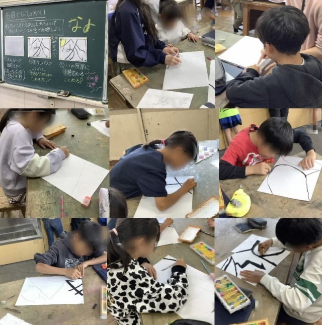 4年生は図工で「なまえをデザイン」した作品作りに取り組んでいます。鉛筆での下書きを終え、クレパスを使って力強い線を描いていました。