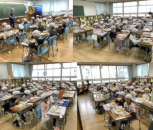 今日から1年生の給食が始まりました。初めての給食に、どのクラスの子どもたちも興味津々。みんなで揃って食べる食事は格別のようで、おいしそうに頬張る笑顔が印象的でした。