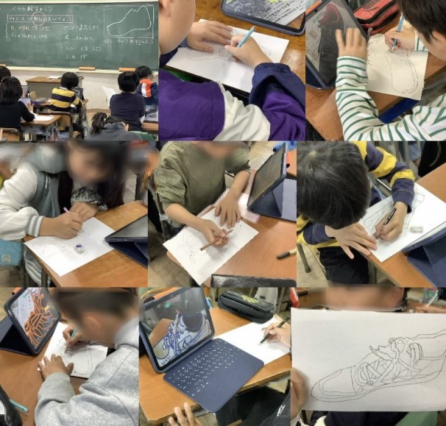 5年生は図工の時間に、「自分の靴のスケッチ」に取り組んでいました。タブレットで撮影した写真をじっくりと観察し、靴の輪郭や紐の重なり、履き込んだ傷などの特徴を鉛筆で丁寧に描き写していました。