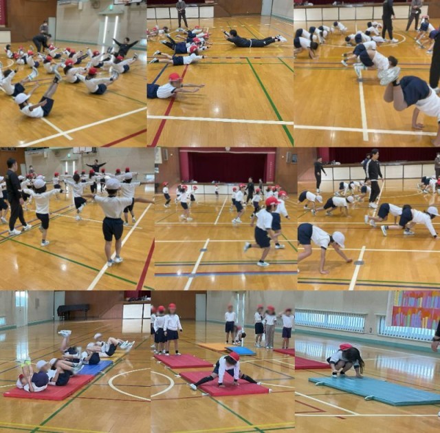 1年生は体操教室の出前授業をうけていました。初めは体幹を強くする運動から入り、少しづつ、とび箱につながる運動を行っていました。子どもたちは楽しそうに取り組んでいました。