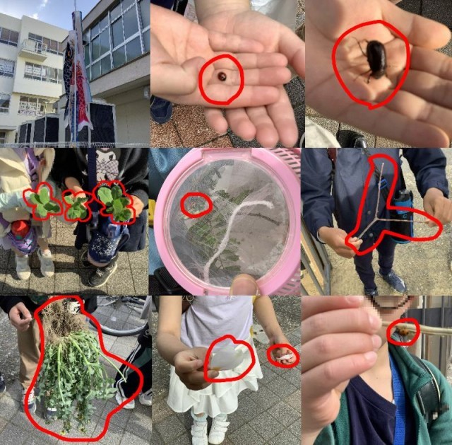 16日から正面玄関前に鯉のぼりが飾られました。「テントウムシ」や「コガネムシ」といった昆虫、さらに「四葉のクローバー」や「きれいな花びら」、「木の枝」や「根っこのついた草」など、バラエティ豊かな自然をたくさんみることができました。