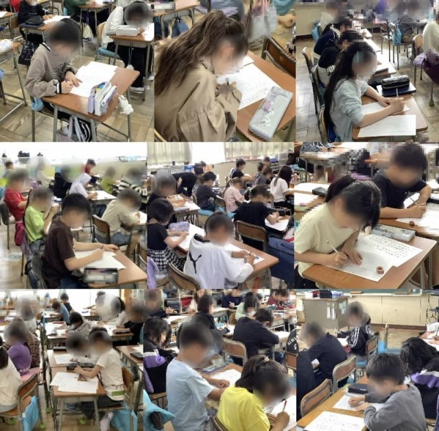 3年生の教室では、漢字学習に取り組んでいました。まずは漢字練習帳の使い方を全員で確認。その後は、ドリルを終えた児童から順に練習帳へと進み、一文字ずつ丁寧に筆を進めていました。