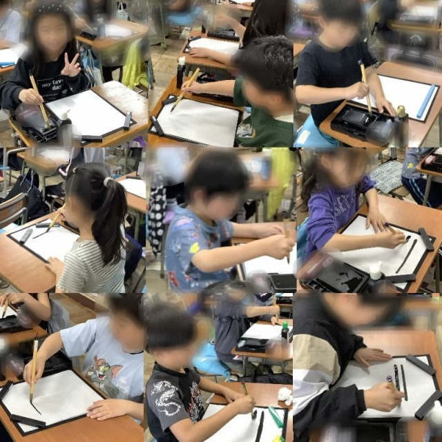 3年生は、初めての「習字」に挑戦しました。筆先を丁寧に整え、半紙に線を引く練習です。毛筆が初めてという児童も多く、少し緊張した面持ちでしたが、墨の感触を楽しみながら筆を進めていました。