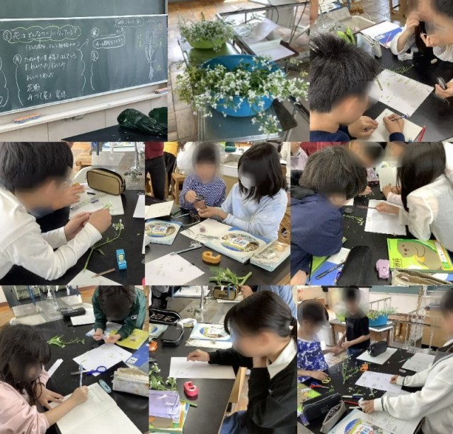 5年生は理科室で「花のつくり」の観察を行いました。用意された花を細かく分解し、ピンセットやルーペを使いながら、気づいたことをノートやプリントに書き込んでいました。
