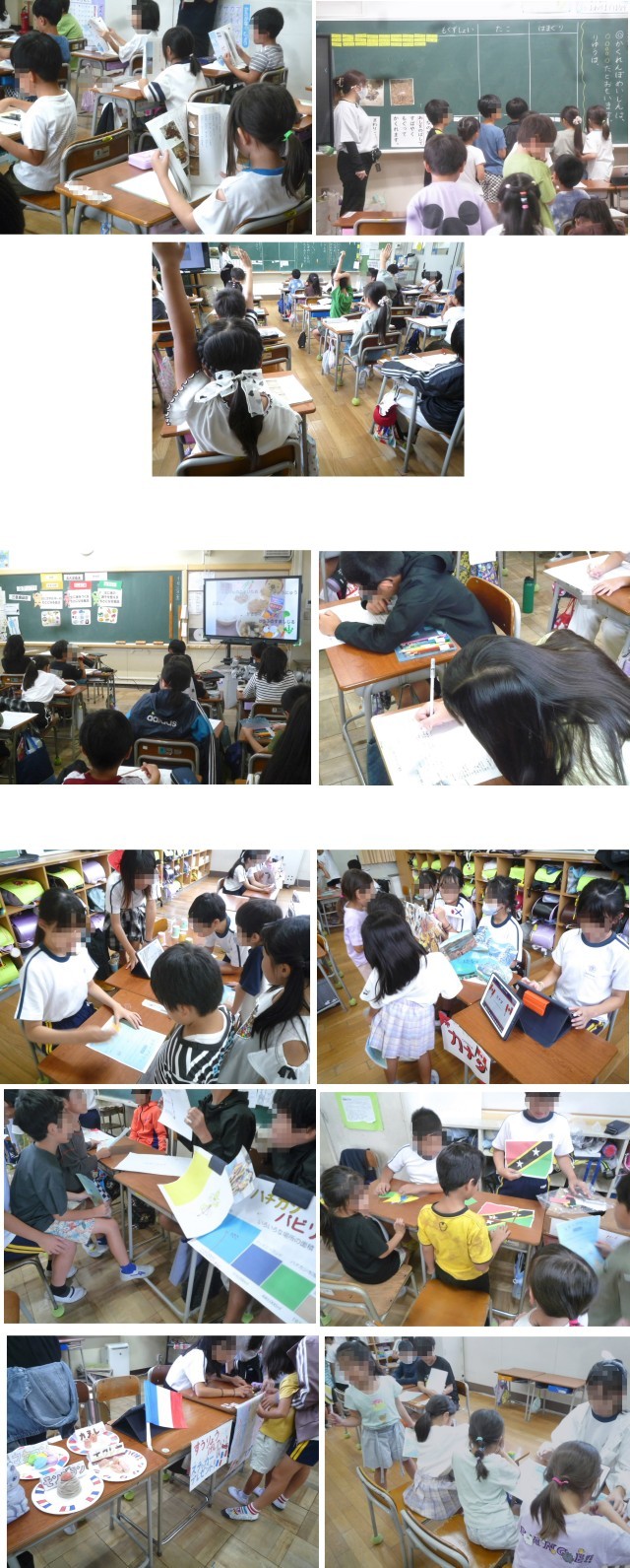 〇6年生で行った「6年生万博」。今日は1年生を「パビリオン」に招待し、調べた国についての紹介をしていました。各「パビリオン」でスタンプを押してもらった1年生は、とても楽しそうに過ごしていました。