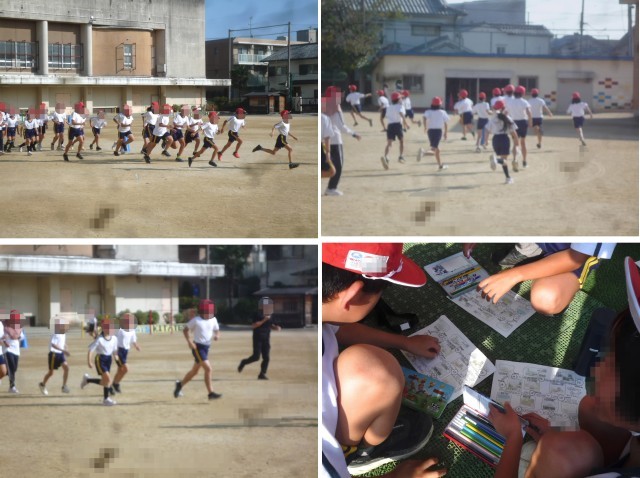 体力向上に向けて、いろいろな取り組みを行っています。体育館での体育の時間は、昨年に引き続き「リズムジャンプ」を行っています。体力と持久力をつけるため、運動場での体育の時間のはじめに「マラソン」を始めました。低学年3分間、中学年4分間、高学年5分間、曲がかかっている中で運動場を走ります。一人ひとり「マラソンカード」が配られています。走った周だけ色を塗っていきます。1枚目のカードは「めざせ五月山」として池田市内を回り、五月山がゴールとなります。