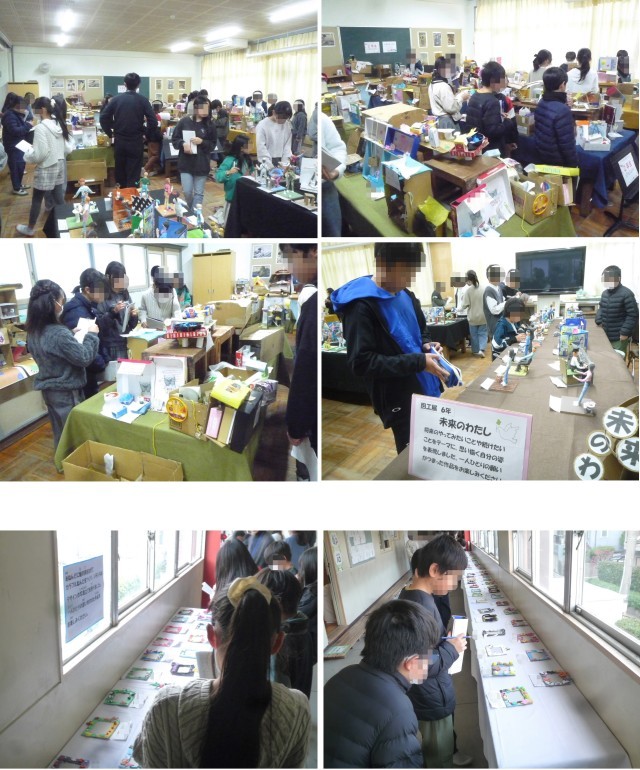 「校内図工展」ははじまりました。各学年での図工学習の発表の場です。各教室や図書館の前の廊下や、図工室に展示されています。各クラスが鑑賞の時間を設け、他学年の作品も鑑賞します。今日はさっそく6年生が、感想を書くためのワークシートをもって各展示場所を回っていました。