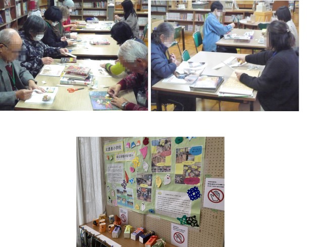 ○午後から、保護者や地域のみなさんに学校図書館に集まってもらいました。傷んだ図書の整理のボランティアをしていただきました。作業が早く、追加で「しおり」作りもしていただきました。ありがとうございました。3学期も予定しています。