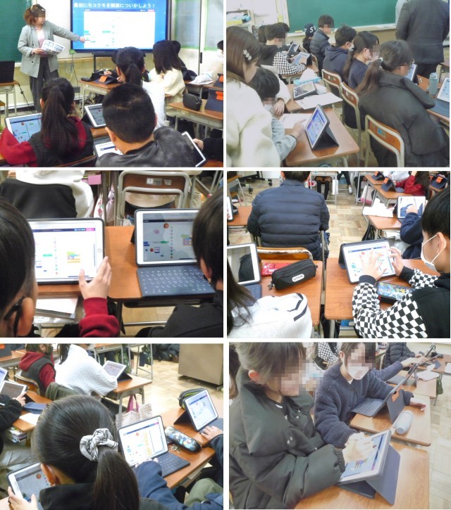 講師の方に来ていただき、6年生が「プログラミング」の学習を行いました。今回は一人ひとりのタブレットを使っての学習です。動きを伝えるボタンをつぎつぎと加え、動きを追加、変更していきました。残りのクラスは木曜日に行います。