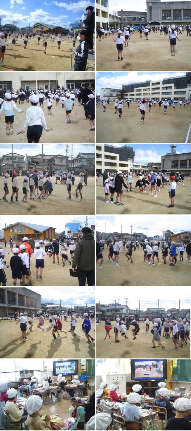 なわとび大会終了後、給食の時間には、事前にビデオ撮りした「チャレンジコーナー」の映像を観ました。「はやぶさ跳び」や「三重跳び」などができる北小っ子の姿がすばらしかったです。先生たちの技も見ることができました。