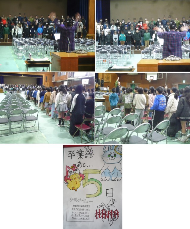 今日の卒業式の練習は歌の練習がメインでした。歌唱指導の講師の方に来ていただき、1時間は6年生だけで、次の時間は56年生合同で行いました。ていねいに、そしてパワフルに指導してもらい、5,6年生の歌声が大きく変わってきました。いよいよ明後日は予行練習となります。