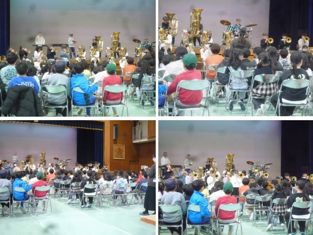 お昼休みに金管クラブが体育館でコンサートを開きました。3月25日池田市内のクラブ音楽発表会「子どものフェスティバル」での演奏曲でした。休み時間にもかかわらず、体育館いっぱいに北小っ子が集まりました。演奏中に動きも入り、あっという間に時間となりました。
