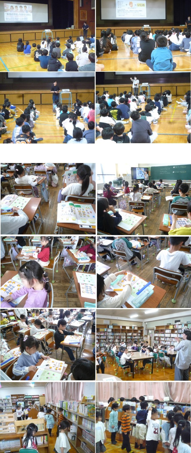 ○今日の1年生。算数ではブロックを使って数の学習スタート。図書の時間は図書室の使い方や自分の座る場所の確認の後、どんな本があるのか図書室を歩き回りました。