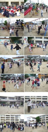 2年生は、クラスごとに黄・青・赤の色違いの「スカーフ」を使って初めて練習をしました。また、4年生も、本番用の4色のカラフルな「ビニール傘」を使って初めて練習を行いました。