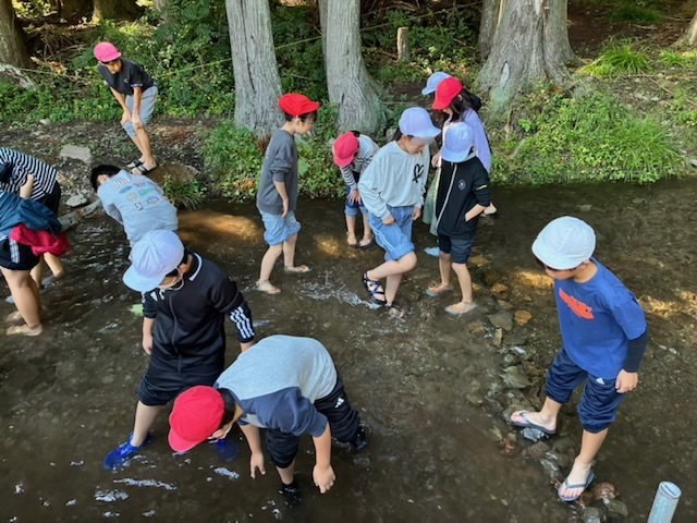ニジマスが岩陰に潜んでいてるので、捕まえるのに苦戦した児童もいました。
