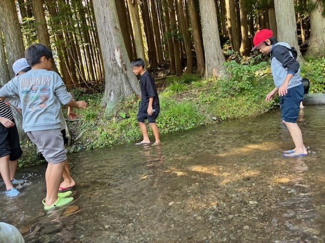午後のプログラム、「生命を頂く(ニジマスつかみ)」と「アルプスアドベンチャー」を行いました。
