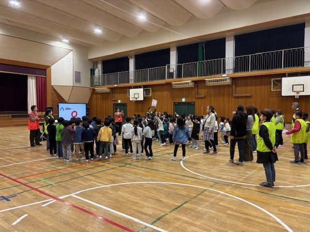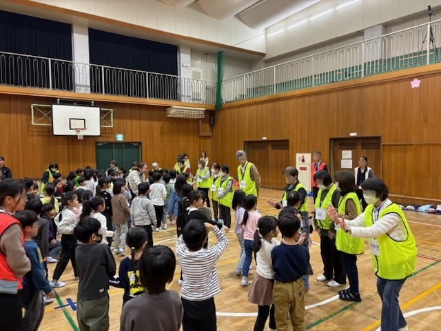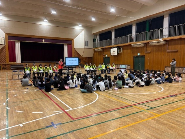 1時間目から日頃から子どもたちの登下校を見守ってくださっている地域の方々に、まず体育館にお越しいただき、呉服小学校の1年生と一緒に通学路のことや、安全のことについて○×クイズで楽しみながら学習・交流を行いました。