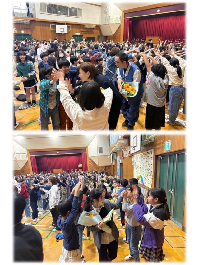 その後、子ども達だけでなく、先生方も最後尾に加わった花道を通って離任式が終わりを迎えました。