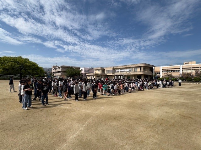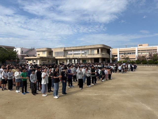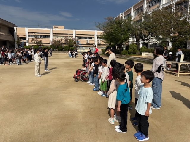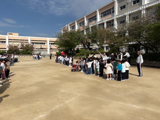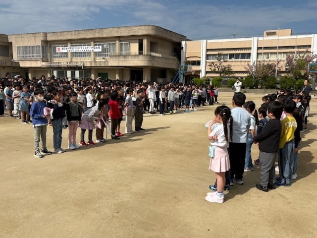 登校してすぐに運動場に出る準備をして、既に整列している2年生から6年生の前を曲に合わせて登場してきました。