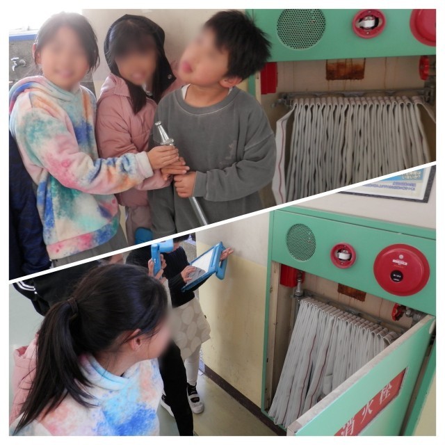 さて、PCルームから廊下を見ると、3年生がタブレットを持ってうろちょろしていました。おそらく社会の「防火設備調べ」だろうと思い見に行きました。