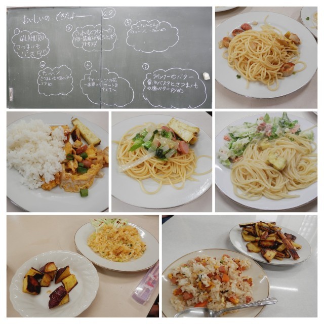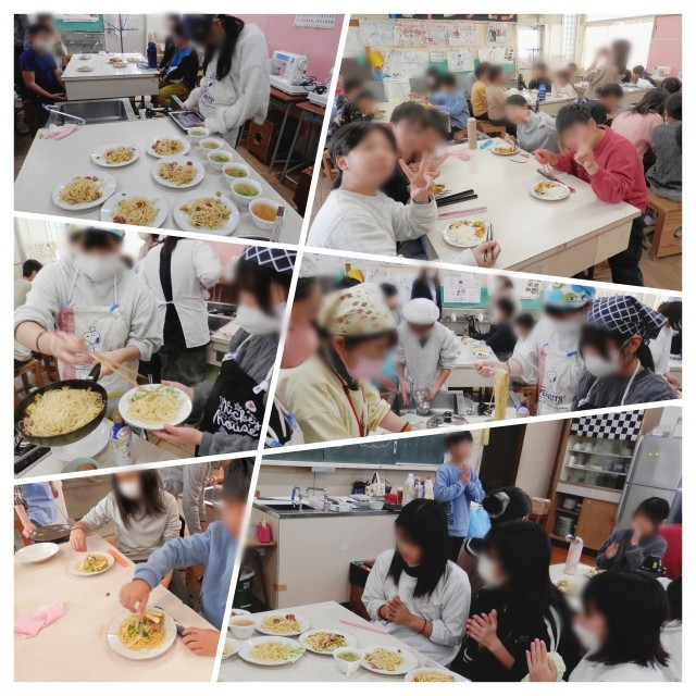 家庭科室からいいにおいが漂ってきましたので見に行くと、6年生の調理実習でした。班ごとにメニューを決めて取り組んだとのことですので、6つの班が6種類の調理に取り組んでいました。パスタとチャーハンを基本に、いろいろとアレンジをして……という感じでしたが、私が行ったときにはどの班も完成間近という感じで、盛り付けもきれいにできていました(「途中までは、ほんっとに大変だったんですよ!」と見守っていた支援の先生が言っていましたが)。