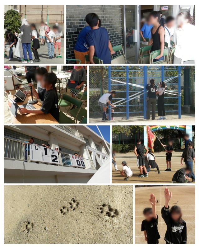 余談ですが、3枚目の左下の写真。今朝運動場のぬかるんでいるところについていた足跡です。明らかに爪のあとがありますので、犬や猫ではありません。