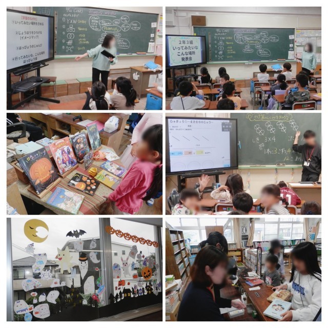 2枚目下の写真は、図書館で行っているハロウィンイベント。図書委員が窓に飾りを作り、カウンターにはハロウィンに関わる本が並べられています。図書館だよりについていた券を持ってきて、「トリック・オア・トリート!」と言って本を借りたら、特製しおりがもらえるとのこと。今日は特別時程で短めの昼休みでしたが、なかなかの大盛況でした。