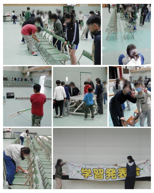 6時間目には、6年生が前日準備として会場設営をしてくれました。パイプいすを並べ、モップ掛けをし、1・2年生の教室から児童イスを持ってきて並べます。6年生の子たちはさすがは最高学年という感じで、てきぱきと作業を進め、あっという間に会場設営ができました。