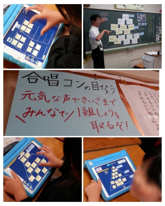ちょっとおもしろかったのが、タブレットへの文字入力です。今どきの「フリック入力」のほか、「あいうえお表」で入力している子や、ローマ字入力をしている子がいる一方、音声入力を自由自在に活用している子が何人もいたことです。3年生はまだローマ字を習い始めたところですので、ローマ字入力へ移行していく過渡期なのですが、いずれにせよ入力するのにタイムラグが生じると、思考ツールの意義も薄れます。子どもたちなりに工夫をしながら使いこなしているのだなあと思いました。