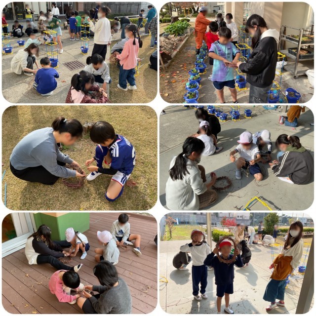 12月に入りました。今日、午前中の子どもたちの様子です。1年生は、ペア学年の6年生に手伝ってもらい、育てていたアサガオのつるを使ったリースづくりをしました。1年生と6年生がそれぞれペアを組み、つるを束ねてリースを作ります。ペア交流を兼ねたリースづくりは、子どもたちの笑顔があふれる楽しい時間でした。