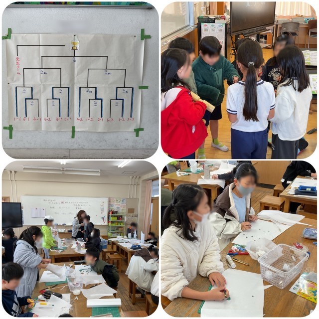 2時間目、2年生音楽の時間では、トライアングルやウッドブロックなどの打楽器を使い、グループで音の重なりを楽しんで演奏していました。5年生図工の時間では、和紙を使った作品を制作していました。自分の好きな形に切ったり模様をつけたりして工夫を凝らした作品をつくっていました。