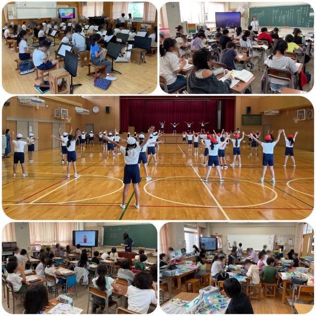 今日、4時間目の子どもたちの様子です。1年生は、国語と図工の授業。国語では、「くじらぐも」を学習していました。2年生は、算数と図工の授業。算数では、かけ算をブロックを使って表していました。3年生は、音楽と外国語活動。音楽では、歌のテストをしていました。4年生は、学年体育。実行委員の人たちが前に出て、ダンスをみんなに教えていました。5年生は、国語と図工の授業。国語では、「たずねびと」の学習に取り組んでいました。6年生は、(写真はありませんが)算数と理科の授業。算数は、テストを実施していました。